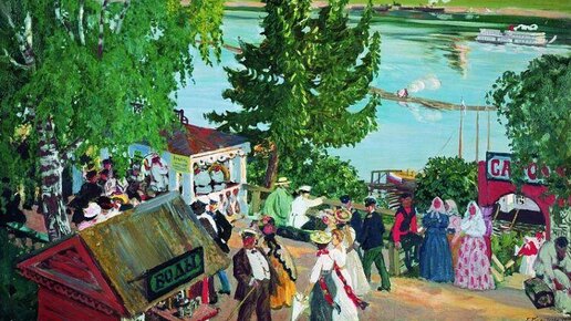"…настоящий Кустодиев — это русская ярмарка, пестрядина, «глазастые» ситцы, варварская «драка красок», русский посад и русское село, с их гармониками, пряниками, расфуфыренными девками и лихими парнями… Я утверждаю, что это его настоящая сфера, его настоящая радость…" Бенуа. Слова Бенуа как никогда подходят к одной из знаменитых картин Кустодиева «Ярмарка», которая была написана им в 1906 году и хранится ныне в Государственной Третьяковской галерее. Здесь мастер воспевает мир русской провинции. Художника привлекает тема шумных деревенских праздников, ярмарочных гуляний и веселых танцев...