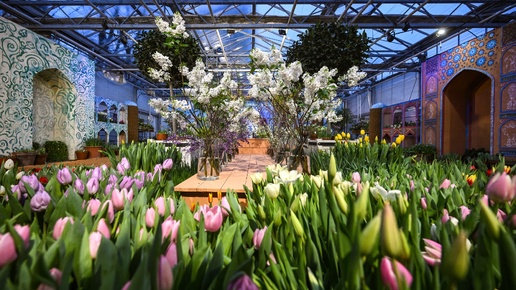 На улице сугробы по пояс, а в "Аптекарском огороде" - цветущий май. Тысячи тюльпанов, нарциссов, крокусов, гиацинтов, а еще ландыши, сирень, подснежники, вишня, сакура, магнолии расцвели здесь на несколько месяцев раньше срока. Выставка "Репетиция весны" вновь открыла свои двери для посетителей. Для москвичей и гостей столицы "Репетиция весны" - особенное событие. Каждый год очередь из желающих увидеть весеннее великолепие, вдохнуть аромат ландышей и гиацинтов растягивается на километры. Выставка настолько популярна, что даже в будни посетители идут нескончаемым потоком...