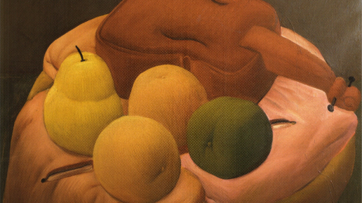 В этой работе колумбийский художник Фернандо Ботеро (годы жизни 1932-2023) рисует натюрморт с фруктами и скрипкой, находящейся на столешнице и обтянутой светло-розовой тканью. Объекты на картине были представлены именно с той объёмностью, с которой запросто могло бы ассоциироваться имя Ботеро. Плоды пухлые, а по краям кажущаяся буквально надутой скрипка выпирает собой наружу. Плотной и «пухлой» кажется даже ткань. По мнению самого Ботеро, живопись в этой манере демонстрирует собой «чувственность формы, сладострастие и изобилие в природе, выраженные в художественном искусстве»...