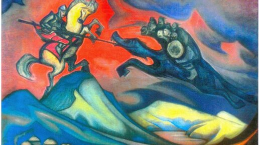 Картина «Бум-Эрдени» является одной из последний работ Рериха, написанная им незадолго до своей смерти в 1947 году. Очевидно ассоциативно отсылая к битве Георгия Победоносца со змеем, картина тем не мнее представляет собой общий для всех культур образ борьбы добра со злом и воспроизводит монгольскую легенду о борьбе Бум Эрдени (ни много ни мало – сына самого Будды) и девятиглавого черного мангуса, чудовища из монгольского фольклора. «Мангус огромен, его утроба вмещает толпы проглоченных им людей...