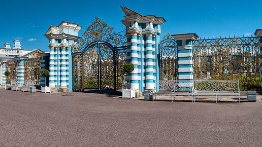 Золотые ажурные ворота соединяют северный и южный флигель, циркумференции, между собой в центре и с Екатерининским дворцом по сторонам...