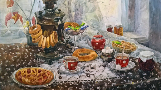 Друзья, в моей акварельной мастерской был поставлен тематический натюрморт "Чайный". Натюрморт выполнила Вернигор Юлия Владимировна, преподаватель ДХШ-1 г.о Тольятти, член ТСХР, по предложенной автором технологии лессировки (Рисунок 1). Натюрморт "Чайный" установлен был у окна, против света, то есть в контражур. На фото видно, что натюрморт составлен из большого количества предметов характерных теме чаепитие (Рисунок 1). Предлагаю вам рассмотреть ход выполнения этого тематического натюрморта. Что...
