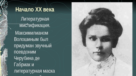Жила девушка одна - Дмитриева Елизавета, Внешне блЕдна, холодна, Очень чувственна при этом. Хоть и скромная училка В питерской гимназии, Но была натурой пылкой И с большой фантазией. Сочинять могла стихи. Их редакторы читали, Говорили, что плохИ, Ничего не издавали. Возлежа на оттоманке, Ей сказал Волошин так: -Станешь знойною испанкой, Черубиной Габриак.- Биографию сочинили, Новый стих. И сухоцвет Ароматный приложили. Уложили все в конверт. . Получил конверт редактор. Содержимым восхищен: -Гений - незнакомый автор!- Стих велел печатать он...