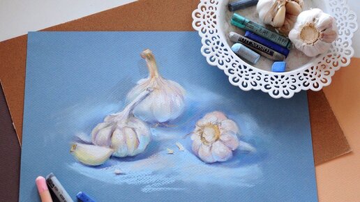 Чеснок, который мало кого оставит равнодушным. Рассказываем, как поэтапно создать вот такой рисунок сухой пастелью. Смотрите инструкцию. Шаг 1. Делаем набросок лёгкими линиями светлым карандашом или мелком (Бумагу специально лучше выбрать потемнее, чтобы наш готовый рисунок смотрелся контрастнее и не сливался с фоном). Шаг 2. «Заливаем» наш чеснок и падающие тени основными цветом, игнорируя детали. Шаг 3. Растушёвываем пальцем пигмент до однородного пятна, постепенно добавляем дополнительные оттенки, чтобы сделать тени и рефлексы на чесноке, и придать ему объём...