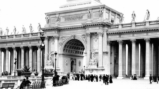 Наверное самая странная из серии мировых выставок прошла в 1883 году в Чикаго. Если остальным можно при сильной заинтересованности, приписать официальную историю и закрыв глаза в нее поверить, то здесь уже никак не получается - остаются вопросы. Даже с закрытыми глазами и слепой верой. Для начала , можно посмотреть , какая о ней сохранилась информация: Официально считается, что кроме Дворца Изящных Искусств остальные здания, в той или иной мере копии, потому как оригиналы были слишком ветхими...