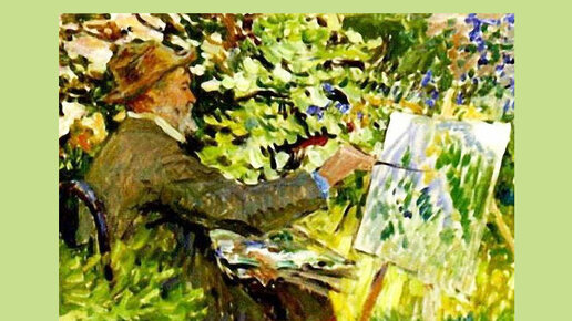 Давайте угадаем, чей портрет на картине? И главное – художник за работой. То есть даже по манере письма мы уже почти догадываемся кто это, верно? Очень динамичный портрет, очень в работе. Сосредоточенность во взгляде, уверенный взмах руки. Картина как продолжение окружающей красоты – возникает столь же стремительно, как и колышется листва на ветру. И мы конечно увидим эту стремительную природную изменчивость на его прекрасных, любимых многими картинах. Это небо как продолжение портрета – как точно...