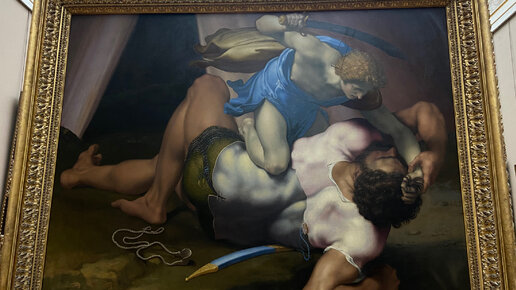 Самая запоминающаяся картина в Лувре как по мне - это двусторонняя картина итальянского живописца Данилле да Вольтерры «Давид и Голиаф». Чем же она так интересна? История Скульптура или картина? Именно этот вопрос долго тревожил художника, но все таки Даниеле решил выбрать второе и усовершенствовать живописную картину, сделав её двусторонней, изобразив одну и ту же сцену, которую можно рассматривать с двух сторон. Картина представляет собой хорошо известный библейский сюжет: Давид попал в лоб великану Голиафу брошенным камнем...