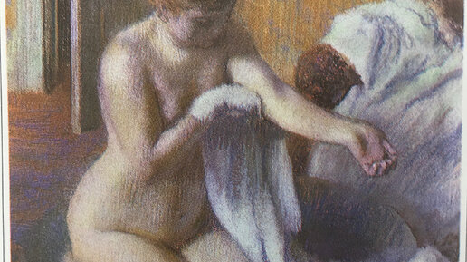 Возможно, это одна из серии пастелей, включающей Таз и показанных на восьмой и последней Выставке импрессионистов в 1886 году; во всяком случае, она близка им по манере и датировке. Работа гораздо теплее по чувствам, чем «Таз», - она бы не смотрелась чужой среди купальщиц Буше или Ренуара. Однако купальщица Дега старательно избегает...