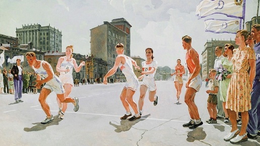 Это случилось летом 1947 года. Художник Александр Дейнека жил в Доме Наркомфина, знаменитом проекте будущего на улице Чайковского. А под окнами шла эстафета. Молодые, сильные, уверенные спортсмены воплощали собой идеал творческих поисков мастера. Ритм и порыв, неостановимая динамика и безоглядный оптимизм. Эти образы буквально просились на холст, и картина не заставила себя ждать. Так родилась «Эстафета по кольцу» — работа, которую можно принять за стилизованный кадр кинохроники. И всё же это была именно живопись...