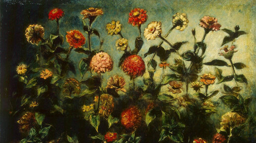 Чтобы закончить писать букет до того, как он завянет, приходилось писать очень быстро... Настолько быстро, что Эжен Делакруа – ведущий живописец французской романтической школы – на время уподоблялся импрессионисту... Именно импрессионист мог творить в лёгкой, непринужденной манере... Быстрыми, но в то же время четкими мазками добиваясь совершенства. Вы только взгляните на цветы, написанные Делакруа... Вот, к примеру, эти циннии. Бутоны цветов художник изобразил ярко освещенными солнцем, а их листья и стебли оставил в тени...