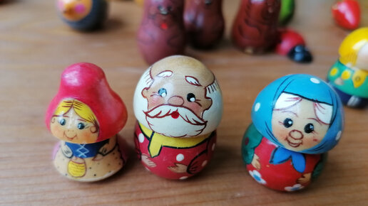 Когда-то двадцать лет назад, когда моя старшая дочка была малышкой, мы для неё нашли интересную "развивашку". Пальчиковый театр из расписных деревянных фигурок по мотивам русских народных сказок: Моя дочь и сыновья с удовольствием разыгрывали сказочки по ролями, это заметно развивало малышковую речь, память на сюжеты, восприятие цвета и формы. В наборах по сказкам было много разных животных, человечков и сказочных персонажей. Посмотрите как замечательно эти игрушечки надеваются на детские пальчики...