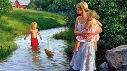 Эти картины трогают сердце и будят прекрасные воспоминания о счастливой поре Детства. Тогда и деревья были выше, и счастья было больше. Мало что помнишь чётко, но есть яркие моменты, которые всю жизнь живут в сердце: теплое ласковое солнышко, игры босиком по траве, просторные луга, цветы у бабушки в саду, ароматные ягоды земляники в сосновом бору, парное молоко и деревенская купалка – весь мир у твоих ног! Это счастливое время прекрасно передал на своих картинах американский художник Роберт Дункан...