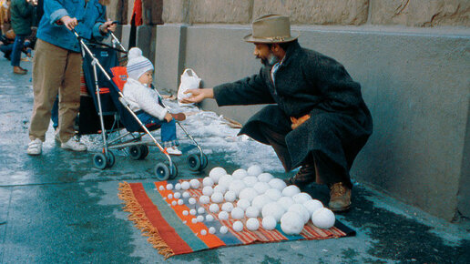 Холодным зимним утром 1983 года, рядом с другими уличными торговцами в нью-йоркской Ист-Виллидж, художник David Hammons продавал снежки разных размеров любопытным прохожим. Он аккуратно разложил ледяные шарики на тканом коврике ровными рядами и провел день, выступая в роли продавца. Недолговечную и необъявленную уличную распродажу он назвал Bliz-aard Ball Sale, включив перформанс в серию работ в которых с конца 1960-х по настоящее время использовались эфемерные действия и материалы, резонирующие с черной культурой...
