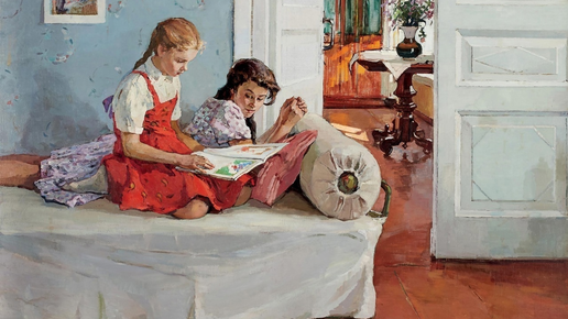 "Девочки", 1969 г. Источник: Соцреализм Какую книгу читают девчонки? А репродукции какой картины висит на стене? И почему именно эта репродукция? И не пойму, что за букет на столе?...