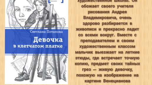 Такой вопрос я задавала себе , читая первые страницы книги Светланы Потаповой "Девочка в клетчатом платке". К живописи я отношусь на "Вы", так как рисовать не умею и знаю о ней не больше, чем обычный школьник. В начале книги читатель, вместе с главным героем рассматривает картины в Русском музее. Лично я полностью представила себя на экскурсии, много интересного рассказывает Дима об известных картинах, например, "Бурлаки на Волге", "Последние дни Помпеи". Какая грамотная речь и хорошая память для...