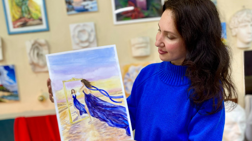 Эту акварель я писала не как сюжет, а как состояние. На картине девушка стоит перед зеркалом. Но это не просто зеркало — это мир. Он не отражает буквально. Он отвечает. Девушка не позирует и не оценивает себя. Она в контакте: с ветром, пространством, собственным телом, с тем, что внутри. Зеркало на картине необычное — из него идёт солнечный свет. Не резкий, не ослепляющий.