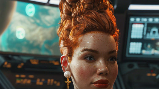 Мне хотелось показать контраст между классической элегантностью и холодной технологичностью — жемчуг и оборки на фоне сияющих панелей создают одновременно чувственность и власть. Делюсь промптом и результатом генерации, чтобы показать, как нейросеть воплотила эту идею. Промпт: A striking woman with vibrant red hair styled in a high bun stands in a futuristic control room. She wears a...