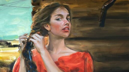 В картине «Гуси-гуси» Александр Чувашев соединяет чувственность и простоту: девушка в ярком платье заплетает косу, глядя на зрителя с лёгким