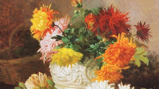 После неё остались только картины. Но мы сегодня не о художниках, а о цветах, которые они изображали на полотнах. Мы будем восхищаться ХРИЗАНТЕМАМИ. И открывает нашу галерею этот удивительно искусно написанный цветочный натюрморт с великолепными хризантенами разных цветов. Я просто никак не могу на него налюбоваться. Пообещав, как водится, вернуться,