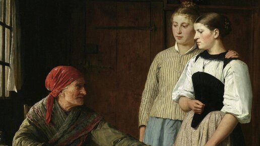 На этой картине мы видим двух молодых девушек и старуху, сидящую за столом перед раскинутыми картами. Девушки очень похожи, скорее всего они сёстры, хотя может и просто подруги. Скорее всего, у одной из героинь начались романтические отношения и она хочет узнать побольше о своём возлюбленном, а заодно и о будущем их отношений. Подстрекаемая любопытством девушка обратилась к бабке-гадалке, чтобы та раскинула карты на её жениха. Однако, судя по всему, расклад героиню совсем не порадовал. Мы видим,...