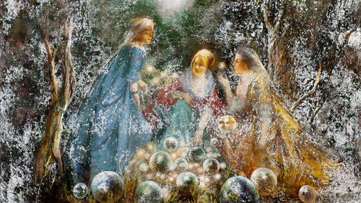 В картине «Девушки с шарами»- художником использована классическая центрическая композиция. Он пишет девушек в старинных костюмах, пользуясь классической цветовой раскладкой голубое платье, зелен, красное и золотое, золотистые лица. Зрителя завораживает эта игра ритмических пятен, диск неба среди зелени и золотистые шары, которые падают на зрителя своей бесконечностью. Все дополнительно покрыто кружевными мазками, которые хочется рассматривать бесконечно, повторяя эти таинственные ритмы скачущих шаров, созданных кистью художника...