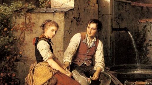 На этой картине мы видим молодую пару — девушку и юношу, которые сидят возле источника с водой. На первый взгляд может показаться, что у молодых любовное свидание, однако не всё так просто. Герой картины явно испытывает тёплые чувства к девушке. Он нежно смотрит на спутницу и держит её за руку. В другой руке парень держит розу нежно-розового цвета, что может символизировать искренние чувства. Девушка же выглядит грустной и даже немного недовольной. Юная красавица отвернулась от парня и смотрит в пол...