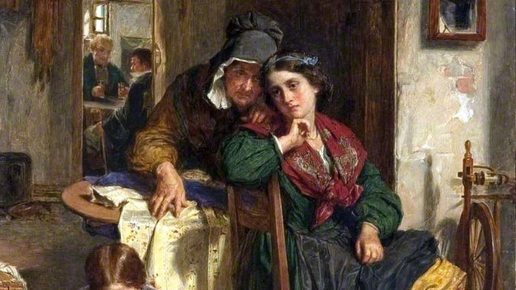 Печальная красавица о чём-то глубоко задумалась. Грустные мысли изредка нарушает шёпот пожилой женщины, склонившейся к самому её уху. Картина «Шёлковое платье» написана шотландским художником Томасом Фаедом в 1862-м году.