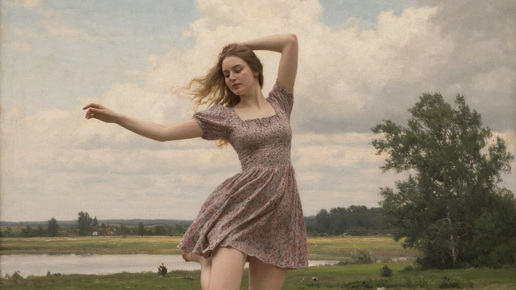 Девушки в коротком платье танцуют, почти на фоне картин Саврасова 20 мгновений