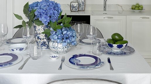Свежий сине-белый интерьер столовой