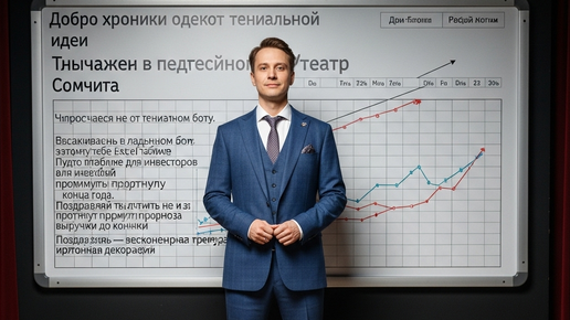 Или хроники одного актёра, который продаёт воздух, чтобы купить пустоту. Три часа ночи. Ты просыпаешься не от гениальной идеи. Ты вскакиваешь в ледяном поту, потому что тебе приснилось, будто в Excel-таблице для инвесторов ты забыл протянуть формулу прогноза выручки до конца года. Твоё сердце колотится не из-за рыночных угроз, а из-за страха, что на сцене твоего театра отклеится картонная декорация. Поздравляю, ты не бизнесмен. Ты — ведущий актёр, режиссёр и осветитель в Театре Успешного Успеха...