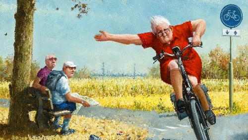 Сегодня воскресенье, я думаю, это — отличный повод расслабиться и погрузиться в причудливый и остроумный мир голландского художника Мариуса ван Доккума. Художник родился в 1957 году и успел прославиться своими ироничными зарисовками из жизни небольших нидерландских городков. Этот мастер нестандартных бытовых сюжетов умело сочетает гротеск с повседневной правдой, заставляя задуматься и одновременно улыбнуться. Представьте себе: седовласая дама на велосипеде, мчащаяся с таким задором, что старички...