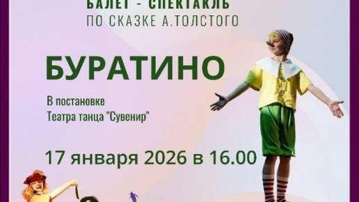 ✨Балет - спектакль «Буратино» по мотивам сказки А.Н. Толстого «Приключения Буратино» Балет - спектакль «Буратино» – это феерия танца и музыки, переносящая зрителей в чарующий мир сказки.🎉 🎭На сцене оживают любимые с детства персонажи: Папа Карло, Буратино, Мальвина, Пьеро, Артемон, Дуремар, черепаха Тортилла, Кот Базилио, лиса Алиса и конечно же хозяин кукольного театра – Карабас Барабас. 🎼Чудесная музыка, изысканные хореографические номера и яркие костюмы создают атмосферу настоящей сказки, где каждый может почувствовать себя частью волшебного мира...