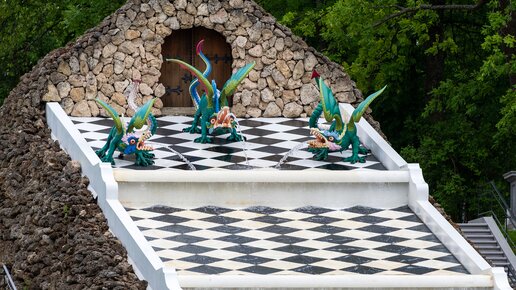 Петергоф — Каскад Драконов "Шахматная гора". Кажется неприступной скалой — обиталищем трех крылатых драконов, стерегущих сокровище, скрытое за массивной дверью, которая закрывает вход в верхний грот.