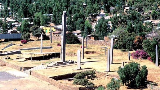 Аксум — древний город, расположенный на юге Эфиопии, столица Аксумского царства, ныне туристический и религиозный центр. На главной площади города находятся 126 гранитных обелисков. Некоторые из них стоят, другие упали. Один из таких упавших обелисков, длиной 34 м, как считается, является крупнейшим обелиском в мире. Памятники имеют разную форму — от простых блоков до причудливо украшенных камней. Некоторые камни с рисунками напоминают высокие изящные здания. Один из обелисков, относящихся к более позднему времени, прославляет утверждение в Эфиопии христианства...