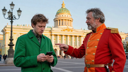 Представь: ты гуляешь по Дворцовой площади в Петербурге, фоткаешь Зимний дворец, и тут к тебе подлетает весёлый «гусар» в ярком костюме.