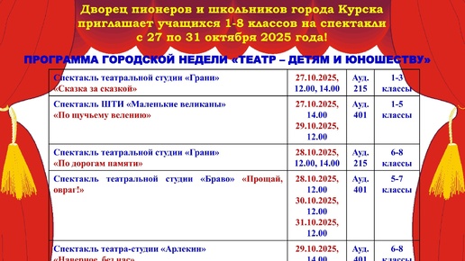 Дворец пионеров и школьников города Курска приглашает учащихся 1-8 классов на спектакли с 27 по 31 октября 2025 года