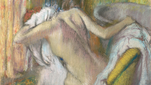 Следующая пастель 1895 года является частью серии рисунков, предварительных набросков и завершенных работ пастелью и маслом французского художника Эдгара Дега (1834–1917), созданных им в 1890-х годах и посвященных теме купания женщин. На рисунке женщина сидит на нескольких белых полотенцах, расстеленных на плетеном стуле, спиной к зрителю. Её тело слегка изогнуто, что создает напряжение мышц спины, подчеркиваемое глубокой линией позвоночника. Одной рукой она вытирает шею полотенцем, вероятно, после того, как вылезла из жестяной ванны в углу комнаты...