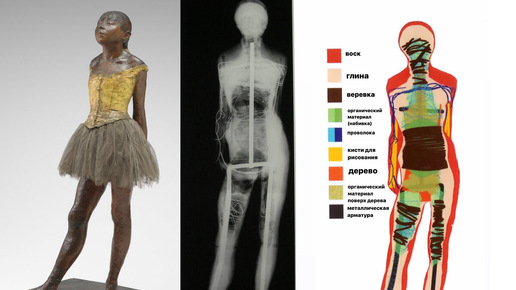 Эдгар Дега, французский художник и скульптор, известен своим уникальным стилем. Его произведения фиксируют моменты повседневной жизни, и "Маленькая (четырнадцатилетняя) танцовщица" не стала исключением... Известные бронзовые версии "Маленькой танцовщицы" были заказаны уже после смерти Дега его наследниками. Оригинальная работа же была создана из окрашенного пчелиного воска. Девочку украшала пачка, атласные туфли и парик из натуральных человеческих волос... Рентген показал, что внутри скульптура имеет каркас, в котором набросаны ватин, ручки кистей, веревки и глина...