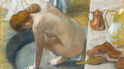 Представленная на восьмой выставке импрессионистов в 1886 году, эта пастель является одной из серии из семи картин, созданных Эдгаром Дега (1834–1917) в середине 1880-х годов на тему женщин во время купания, — тема, которую художник уже исследовал в серии монотипий примерно десятью годами ранее. Его пристальное наблюдение за интимными, повседневными жестами женщин сильно отличается от традиционных романтических сцен дам за туалетом. Поза молодой женщины, которую современные критики иногда интерпретировали как показ животной натуры модели, восходит к позе «Венера на корточках» из античности...