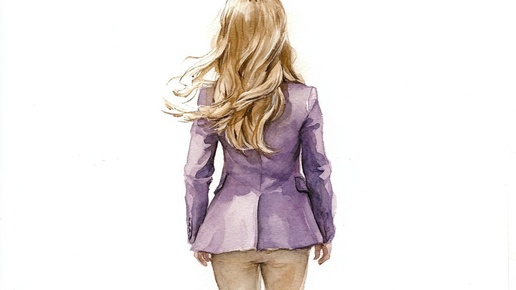 Создано на основе запроса: a watercolour drawing of a young girl with back facing walking away, in a lilac blazer with cream leggings and