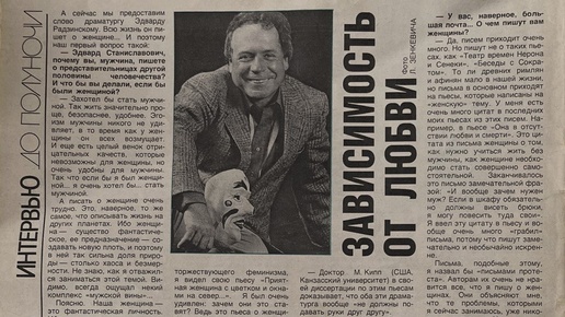 Это не переосмысление и не реконструкция: перед вами оригинальное интервью Эдварда Радзинского журналу «Работница» 1987 года, сохранившее интонации, смыслы и даже паузы времени, которое уже стало историей. «А сейчас мы предоставим слово драматургу Эдварду Радзинскому. Всю жизнь он пишет о женщине, и поэтому наш первый вопрос такой: — Эдвард Станиславович, почему вы, мужчина, пишете о представительнице другой половины человечества? И что бы вы делали, если бы были женщиной? — Захотел бы стать мужчиной...