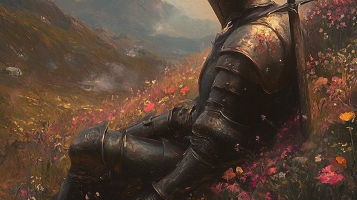 Создано на основе запроса: a dreamy oilpainting of a knight in medieval armour sitting in a field of flowers, the mood is melancholic and dreamy v 6.1 --- Автоперевод: Мечтательная нефтяная рыцаря в средневековой доспехах, сидящей в поле цветов, настроение меланхолично и мечтательно V 6...
