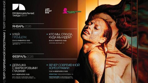 Екатеринбург Зимний репертуар театра "Провинциальные танцы" ГДЕ: Колизей, проспект Ленина, 43, г. Екатеринбург ▶ Билеты на сайте театра Действует Пушкинская карта Начало всех показов в 19:00 💡Будьте внимательны: двери театра открываются за 40 минут до начала показа, а закрываются через 10 минут после начала спектакля! ▫30, 31 января КТО МЫ, ОТКУДА, КУДА МЫ ИДЕМ? | 16+ | 80 мин Хореограф: Павел Глухов ▫6, 7 февраля ДЕВУШКА С ФАРФОРОВЫМИ ГЛАЗАМИ | 16+ | 60 мин Хореограф-постановщик: Татьяна Баганова...