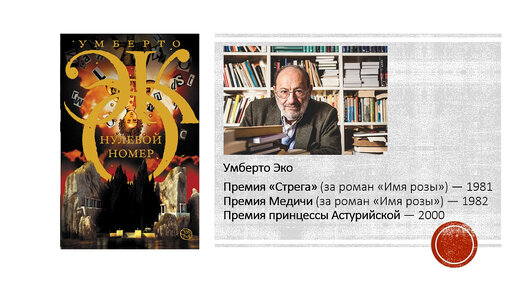 Итальянский учёный, философ, литературный критик, писатель, публицист Умберто Эко (1932—2016) был человеком заслуженным. Не буду перечислять высшие государственные награды Италии, Франции, Германии, которыми он был награждён, но упомяну премии. За свой роман «Имя розы» Умберто Эко в 1981 году получил премию «Стрега», а в 1982 году — премию Медичи в номинации «Для иностранных писателей». Также Эко является лауреатом премии принцессы Астурийской в области коммуникаций и гуманитарных наук (2000 г.)...