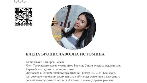 Елена Истомина родилась в Таганроге. Член Творческого союза художников России, Союза русских художников, Евразийского художественного союза. Обучалась в Таганрогской художественной школе им. С.И.Блонской, для совершенствования своих навыков обучалась живописи у известного российского художника Алексея Адамова, а также у других русских художников. Дипломант и победительмногочисленных городских, региональных, общероссийских и международных выставок и конкурсов...