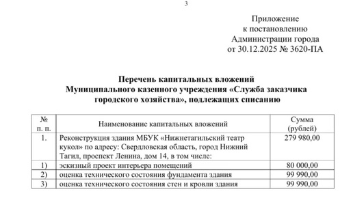 Администрация Нижнего Тагила разрешила СЗГХ списать средства, потраченные на реконструкцию здания Театра Кукол. Речь идет об эскизах и оценке состояния здания. 📌80 тысяч рублей на эскизный проект интерьера. 📌99,9 тысяч рублей на оценку фундамента. 📌99,9 тысяч рублей на оценку стен и кровли...