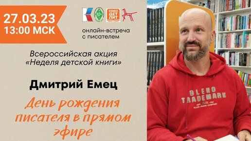 Уважаемые педагоги и библиотекари! Приглашаем вас и юных читателей стать участниками бесплатной Всероссийской благотворительной акции «Неделя детской книги», которая будет проходить с 23 по 31 марта 2023 г. Зарегистрироваться на мероприятие, узнать подробности можно на сайте Союза детских и юношеских писателей: https://souzdetlit.ru/ndk2023/. 27 марта в 13:00 пройдет встреча «День рождения писателя в прямом эфире» с детским писателем Дмитрием Емцом. В честь праздничной, «книжкиной» недели мы взяли интервью у автора...