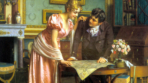 На этой картине мы видим молодую пару — мужчину и женщину, которые увлечённо беседуют, разглядывая карту. На первый взгляд можно подумать, что это молодожёны выбирают куда бы поехать в свадебное путешествие. Пара действительно является молодожёнами, которые поженились буквально на днях. На столе мы видим свадебный букет, перевязанный белой лентой, который ещё не успел завянуть. Молодые и правда собираются в свадебное путешествие, но не в простое. Судя по названию картины, пара обсуждает гран-тур — популярный вид путешествия для молодёжи в XVIII–XIX веках...