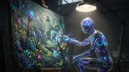 Вы когда-нибудь задумывались, что будет, если соединить творчество и технологии? Перед вами — результат этого удивительного симбиоза! 🖌️🤖 На этом завораживающем изображении мы видим, как киборг-художник с помощью кисти создаёт фантастическую картину. Кажется, будто сам разум нейросети материализовался в этом персонаже: светящиеся нейронные связи, прозрачная структура тела, энергия, пульсирующая в каждом движении. А на холсте — целый подводный мир с неоновыми медузами и загадочными существами, словно сошедший со страниц научно-фантастического романа...