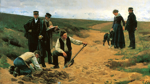 На этой картине художник изобразил группу людей, двое из которых только что раскопали яму, ещё двое наблюдают и что-то записывают, а ещё двое стоят поодаль. Давайте попробуем разобраться, что же здесь происходит. Картину написал датский художник-реалист Эрик Хеннингсен, который в своём творчестве часто использовал сюжеты, увиденные собственными глазами. Не стала исключением и его работа под названием «Детоубийство», где мастер рассказывает историю о матери, избавившейся от собственного ребёнка. На картине мы видим женщину, которую держит под руку полицейский...